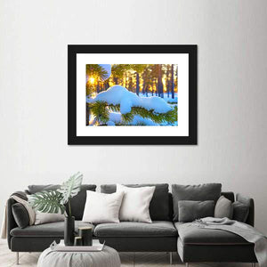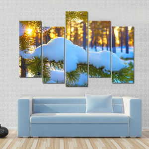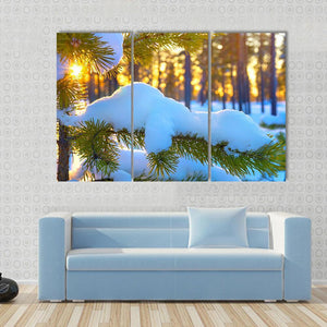This canvas art captures a serene winter scene featuring a close-up of a pine branch dusted with snow. Sunlight filters gently through the trees, creating a tranquil atmosphere perfect for bringing the beauty of nature indoors.