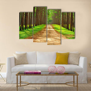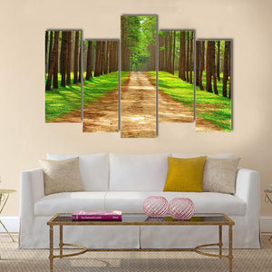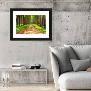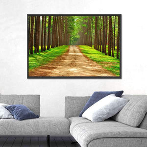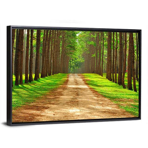 Pine Forest In Thailand shows a sunlit dirt road leading through a symmetrical stand of pine trees bordered by green grass, capturing a peaceful, natural scene. The realistic landscape uses greens, browns and warm yellows with sunlight dappling on the road. It works well as calm room decor in modern homes, especially living rooms or bedrooms.