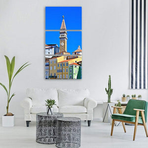 Piran Tower and Church in Slovenia presents a realistic cityscape focused on a tall clock tower and colorful buildings. Bright blues, yellows and oranges give the scene a vibrant, sunny, cheerful feeling, and it works well in modern interiors as lively room decor.