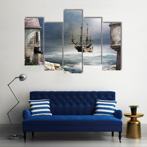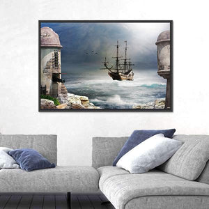 A vintage-style maritime scene of a tall pirate ship anchored in a rocky bay beside stone fort towers, with cannons visible under a stormy, atmospheric sky. Rendered in blues, greys, whites and browns, this canvas print brings an adventurous, dramatic mood that works well with nautical or vintage room decor in the home.