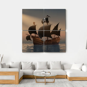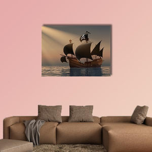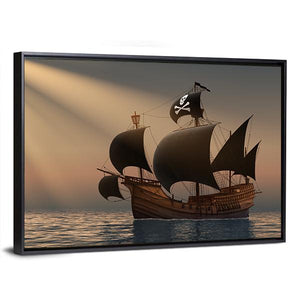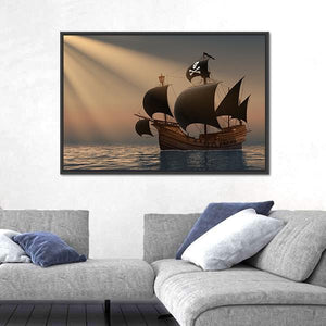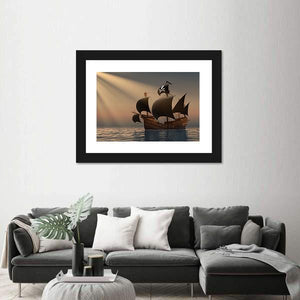 This canvas art captures a pirate ship sailing across a tranquil ocean under dramatic sunbeams. The blend of brown, blue, and gold hues creates an adventurous and mysterious atmosphere, making it a striking addition to your wall decor.