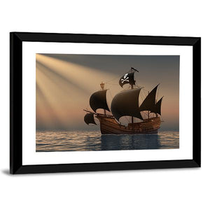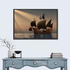 Pirate Ship In Rays Of The Sun depicts a photorealistic pirate ship on the open ocean, lit by rays of the sun and flying a skull-and-crossbones flag. The composition uses depth and rule-of-thirds to create an adventurous, dramatic mood. Brown, black, blue and gold tones suit modern home room decor.