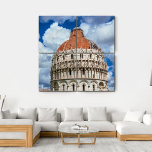 This canvas art captures the majestic dome of the Pisa Baptistry, showcasing its stunning Romanic architecture and intricate arches against a backdrop of bright blue skies and fluffy clouds. It brings a sense of history and serenity to any space.