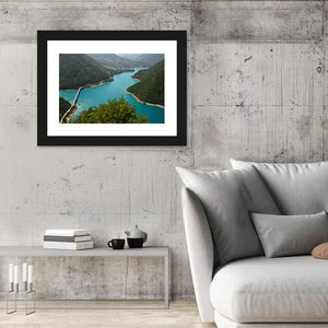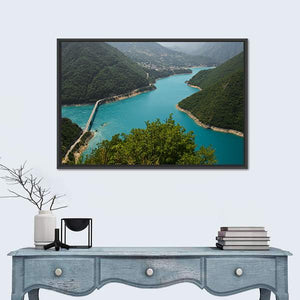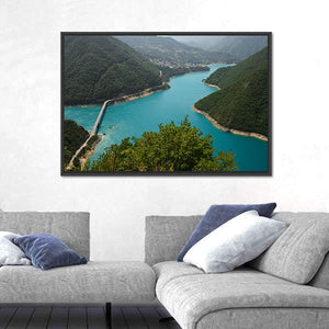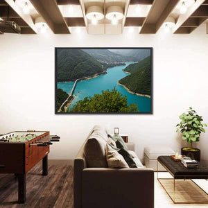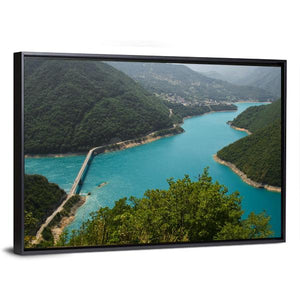Experience the serene beauty of Pivsko Lake in Montenegro with this stunning canvas wall art. The artwork features a high-angle view showcasing turquoise waters surrounded by lush green mountains, a long bridge, and a quaint village nestled in the valley, creating a vast and majestic atmosphere.