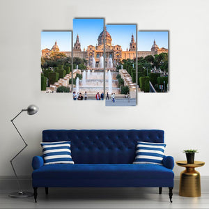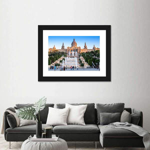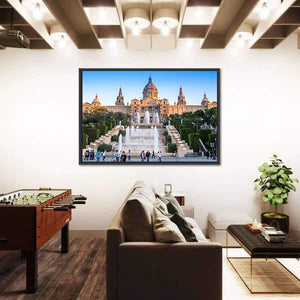 This canvas art showcases the stunning Palau Nacional in Barcelona, with its majestic dome and serene fountain surrounded by manicured hedges. Its vibrant palette of blue, beige, green, and white creates a tranquil vibe, making it a beautiful addition to any wall.