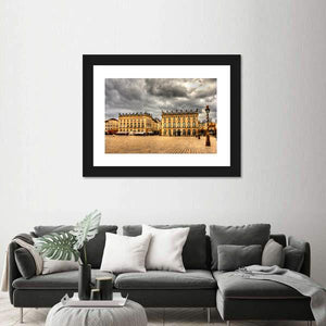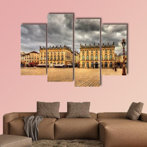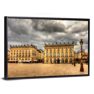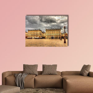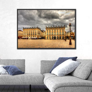 Place Stanislas in Nancy, France is a photorealistic canvas print of the city square, centered on classical buildings, an ornate street lamp, and cobblestone pavement. Soft yellow, grey, brown, and blue tones sit beneath an overcast, dramatic sky. It suits modern or architecture-focused rooms and works well in living areas or hallways.