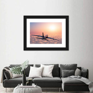 This captivating canvas features a large airplane soaring above billowing clouds during a serene sunset. The palette of pink, orange, and blue evokes a peaceful, awe-inspiring atmosphere that's perfect for enhancing any space.