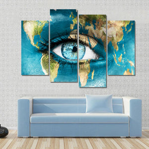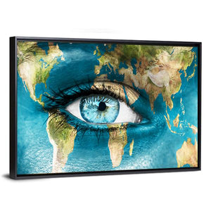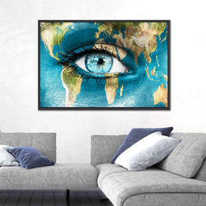This captivating piece features a blue human eye overlaying a world map, offering a surreal glimpse into our planet. The thoughtful imagery, enhanced by droplets that resemble tears, inspires reflection on global interconnectedness and environmental issues.