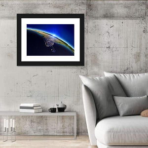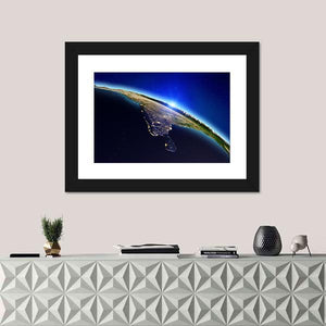 Experience Earth from space with this breathtaking canvas that captures continents at night, illuminated by city lights. The sun rises on the horizon, creating a serene and hopeful atmosphere that beautifully enhances any wall.