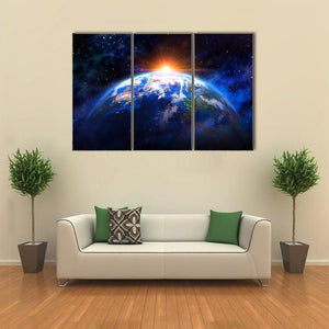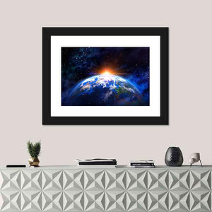 This canvas wall art captures Earth from space, bathed in the warm glow of a rising sun. With a cosmic and peaceful mood, it's a stunning addition that evokes wonder and tranquility.
