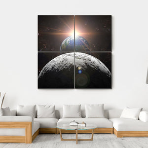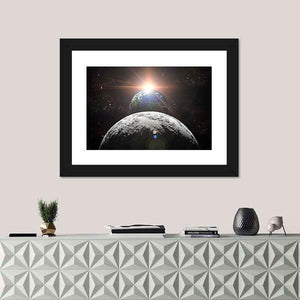 This canvas art captures the beauty of our planet amidst the cosmos, featuring Earth, the Moon, and the Sun. The design evokes a vast and awe-inspiring atmosphere, making it a striking addition to modern décor.