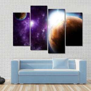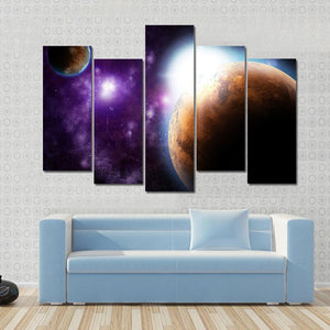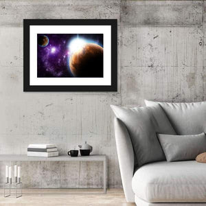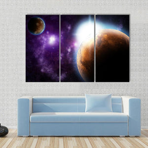 This canvas wall art features a stunning depiction of a large planet in vibrant hues of purple and orange, set against a deep space backdrop filled with a starfield. Its ethereal and mysterious mood makes it a captivating addition to any space-themed décor.
