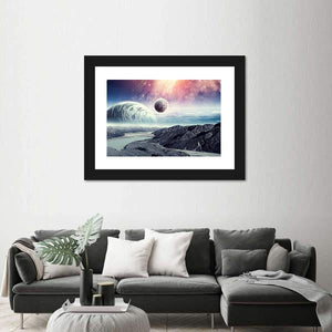 Explore the cosmos with this captivating canvas featuring alien landscapes, majestic planets, and distant nebulas. The vibrant palette of blues, pinks, and greys creates a cosmic atmosphere that invites awe and inspiration.