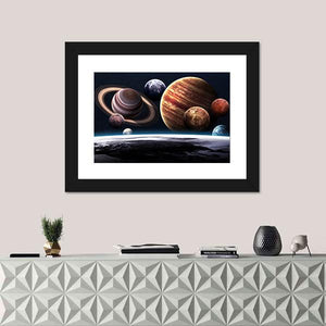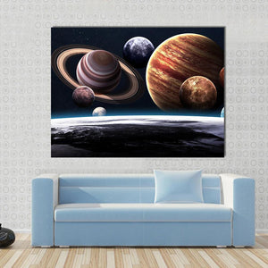 This canvas artwork beautifully captures the vastness of space, featuring planets like Earth and a Saturn-like planet with prominent rings. The rich colors and depth create a cosmic atmosphere, making it a perfect addition to any modern decor.