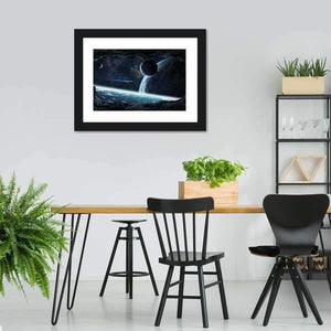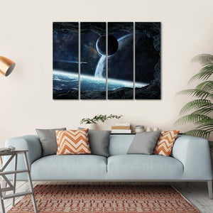 This canvas art captures a breathtaking view of a galaxy from a rocky outcrop, showcasing vibrant planets amidst a mysterious, vast backdrop. With its deep blue, black, and purple hues, it adds a touch of epic wonder to your space.