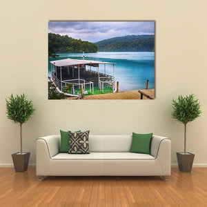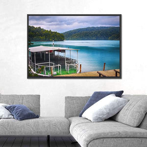 This artwork captures a serene scene of a boat resting on the tranquil waters of Croatia's Plitvice Lakes, framed by lush forest hills. Its calm blue and green tones invite a picturesque touch to your walls.