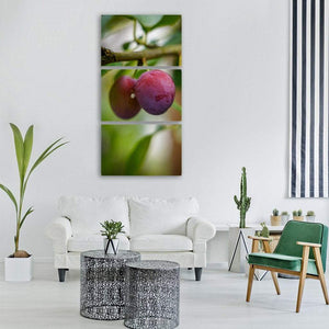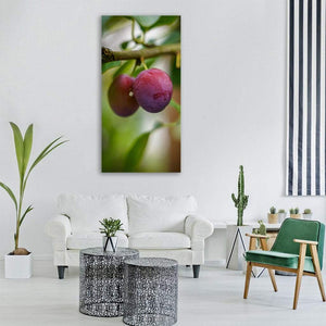 A close-up study of two ripe plums on a tree branch, rendered in photorealistic detail with a fresh, organic feel. Purple, green, and brown tones create a calm, natural atmosphere that suits modern or nature-inspired rooms like kitchens and dining areas.