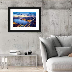 This canvas wall art captures the serene beauty of the Ponte De Dom Luis Bridge spanning the River Douro. Featuring a vivid palette of blue, orange, and white, this piece evokes a vibrant twilight mood with stunning reflections of city lights on the water.