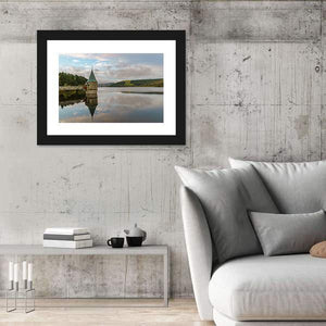 This landscape canvas features a serene view of the Pontsticill Reservoir, showcasing a stone tower with a conical roof surrounded by trees and hills. The calm water reflects the picturesque scene, enhancing the tranquil atmosphere of your space.