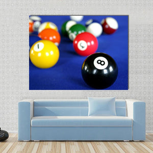 This vibrant canvas art captures the intensity of a game with a close-up view of numbered pool balls and the iconic eight ball on a blue pool table. The rich colors create a striking visual that adds a dynamic touch to any space.