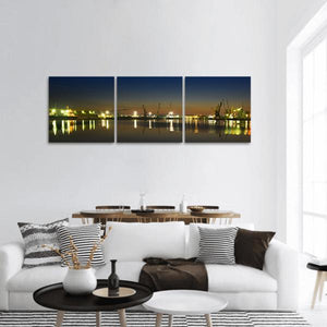 Port Burgas in Bulgaria captures a wide nighttime harbor panorama with silhouetted cranes and lights reflected across calm water. Dark blues, black and warm yellow-orange highlights create an industrial, tranquil mood. The piece suits modern or industrial interiors such as living rooms, offices, and loft spaces.