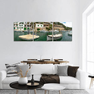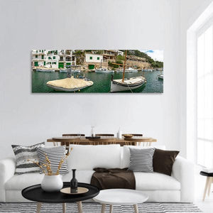 A panoramic canvas print of boats moored in the harbor of Port of Mallorca, Spain. The realistic, sunlit scene highlights buildings on a hillside and green water, offering a calm, serene mood that suits coastal or modern interiors.