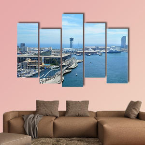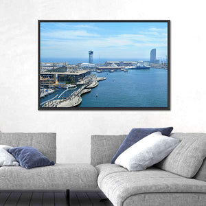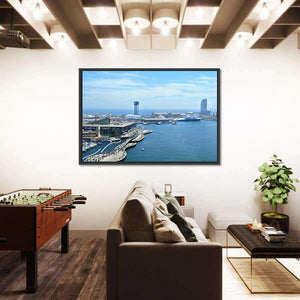 Photorealistic canvas of Port Vell and Maremagnum in Barcelona, showing the harbor and waterfront with docked boats, buildings, a tall tower and a curved pedestrian bridge under a bright, sunny sky. The aerial perspective and a blue, white, gray and green palette give a busy coastal city mood. It suits modern home décor and coastal-themed rooms.