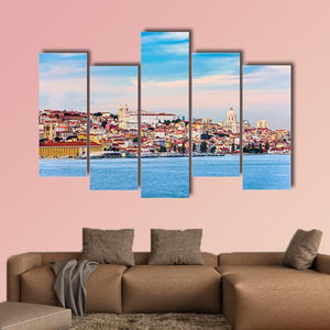 A wide, realistic cityscape of the Portugal skyline along the Tagus River, showing waterfront buildings, domed roofs, and colorful rooftops under a blue sky with wispy clouds. Sunlit blues and warm accents create a vibrant, peaceful mood that suits modern or coastal-inspired living rooms, hallways, or home offices.