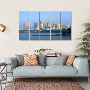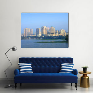 This serene canvas art captures the vibrant cityscape of Powai, Mumbai. Featuring high-rise buildings set against a clear blue sky and calm waters, it brings a bright and refreshing atmosphere to any space.