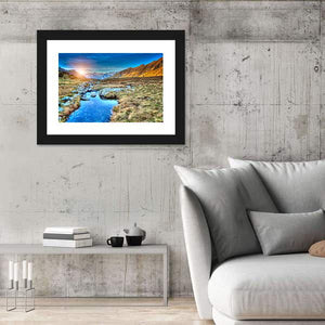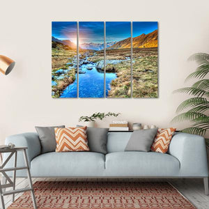 This canvas features a serene landscape of mountains with sunlight glistening over a rocky stream bed. The calming palette of blue, green, brown, and gold creates a tranquil atmosphere, perfect for bringing a touch of nature indoors.