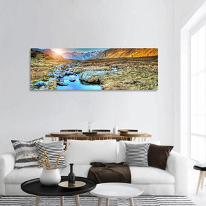 A photorealistic panoramic view of Idaho mountains, river, and grasslands at sunset. The wide-angle scene shows a stream flowing over rocks with golden light behind the peaks, giving a serene, tranquil, and expansive atmosphere. Sized for wall display, it works well as home or office wall decor.