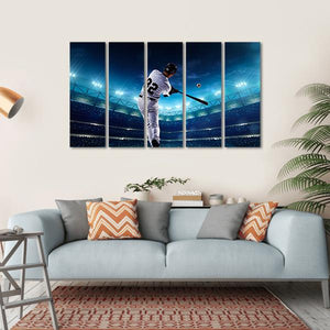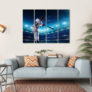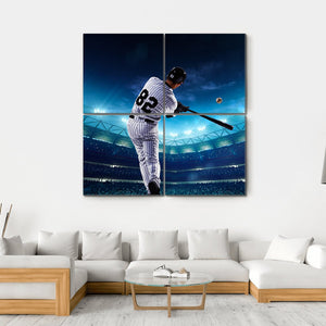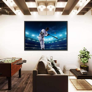 This dynamic canvas art captures the exhilarating energy of a night baseball game, featuring an action shot of a player with number 82 at a grand stadium. The vibrant palette of blue, white, and bright stadium lights creates an exciting atmosphere perfect for any sports enthusiast.