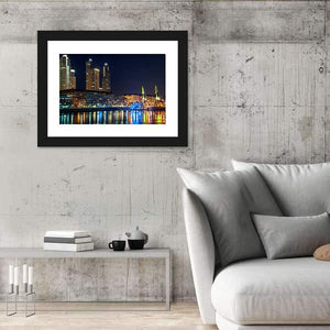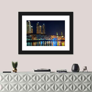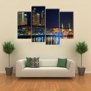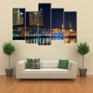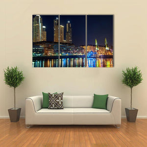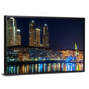 This vibrant canvas art captures the dynamic skyline of Puerto Madero at night, showcasing cranes and buildings reflected in the water. The modern palette of blues, yellows, and blacks adds an energetic touch, making it a striking addition to your wall decor.