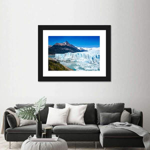 Puerto Madryn, Argentina appears as a cool, expansive landscape of glaciers, jagged ice formations and snow-capped peaks beside a blue lake. The composition emphasizes depth and the rule of thirds to convey a serene, majestic sense of space. Works well in modern homes or nature-inspired rooms.