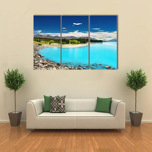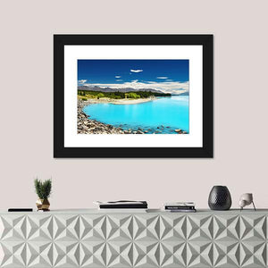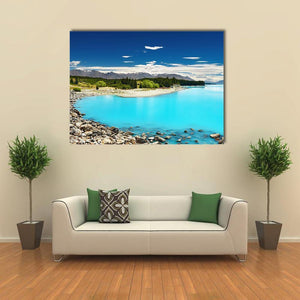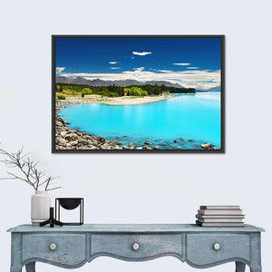 Pukaki Lake in New Zealand is shown as a realistic, vibrant landscape of clear blue water, rocky shoreline, trees and snow-capped mountains. The rule-of-thirds composition creates a serene, majestic mood with lively, natural color. Suited to modern homes and room decor that favor nature-focused art.