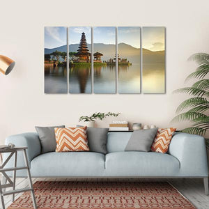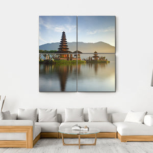 This stunning canvas art features a serene temple reflected in the tranquil waters of Lake Bratan, framed by majestic mountains. With a realistic style and a harmonious blend of blue, brown, and green tones, it captures the essence of peaceful mornings or dusky evenings, making it an ideal choice for a calm and inviting atmosphere in your space.