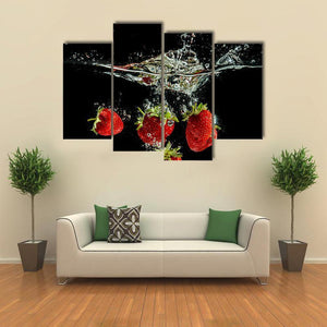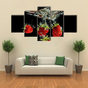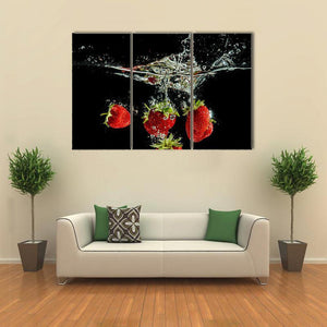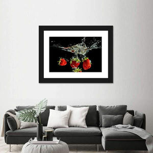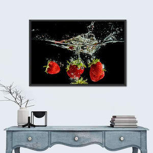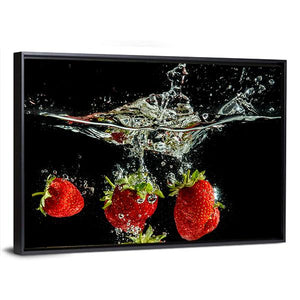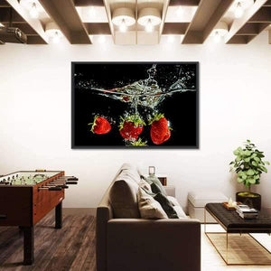 This photorealistic canvas captures ripe strawberries plunging into clear water, frozen mid-splash with visible droplets and air bubbles. The rule-of-thirds composition and a red, white, black, and green palette give it a dynamic, refreshing, vibrant feel. Suits modern homes and kitchens as nature- and food-inspired wall art.