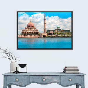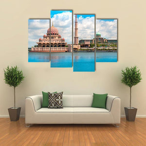 Putra Mosque in Kuala Lumpur sits centered over calm water, its pink dome and tall minaret set against a soft blue and pink sky with puffy clouds. The scene feels serene and majestic and works well as a quiet focal point in modern living rooms or entryways.