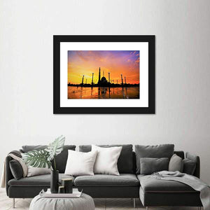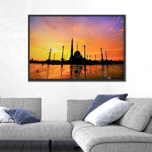 This canvas wall art captures the serene silhouette of Putra Mosque against a dramatic sunset. The vibrant palette of orange and purple evokes a peaceful atmosphere, making it a beautiful piece for any art lover.