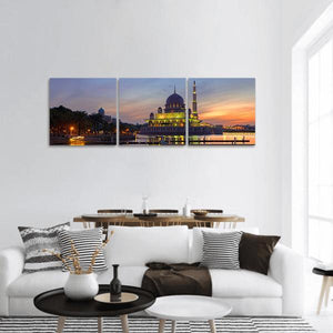 A panoramic, photorealistic view of Putra Mosque in Malaysia at twilight, with its dome and minaret reflected on calm water. Soft orange, purple and blue tones create a serene, majestic mood that suits modern living rooms or quiet, contemplative spaces.