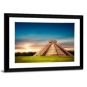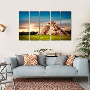 This canvas art captures the grandeur of El Castillo pyramid at Chichen Itza, showcasing serene Mayan ruins set against a palette of blue, orange, green, and brown. It's a compelling piece for those who appreciate historical landscapes.