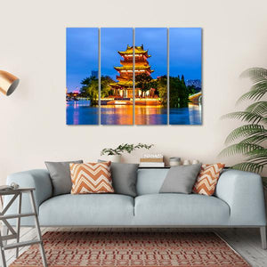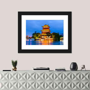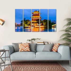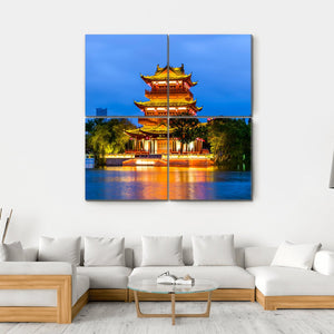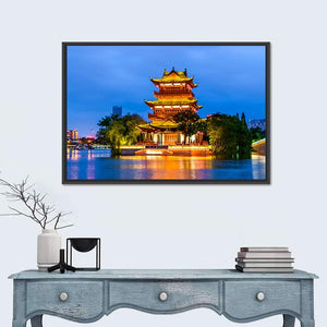 This captivating canvas artwork depicts the serene Qingjiang Pu Building amidst a tranquil lake and lush trees. The vibrant palette of blues, golds, and greens creates a soothing atmosphere perfect for any space.