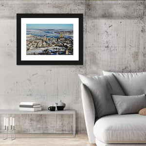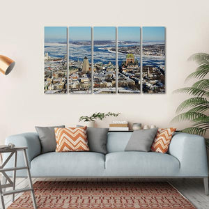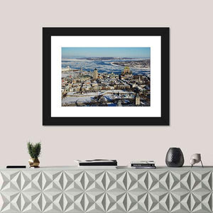 This canvas art captures a breathtaking aerial view of Quebec City in winter, showcasing its iconic skyline, buildings, and the serene river surrounded by ice floes. The cool color palette of blue, white, and grey evokes a peaceful yet majestic atmosphere, making it a striking addition to any wall in your home.