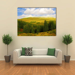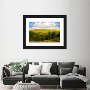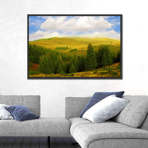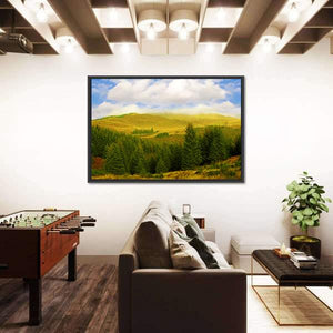 This landscape artwork features a serene pine forest with rolling hills under a blue sky and soft clouds. The realistic depiction captures sunlight filtering through the trees, inviting a natural vibe into your space.