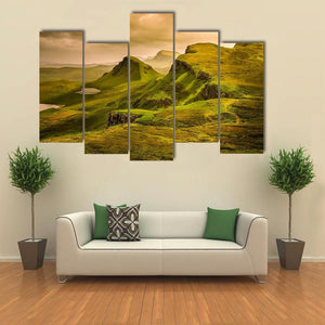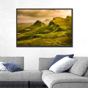 This canvas art captures the serene beauty of the Quiraing Mountains at sunset, showcasing rolling green hills and textured clouds. Its majestic atmosphere makes it a striking addition to any wall décor.