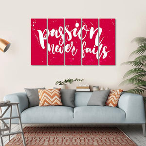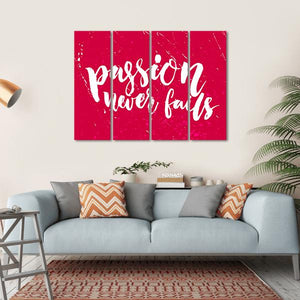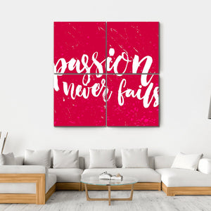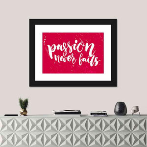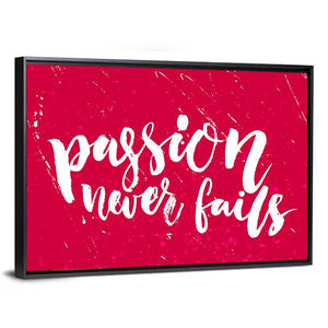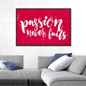 This vibrant piece features the inspiring quote 'Passion Never Fails' in a bold, modern typography design. With a striking red and white palette, it radiates motivational energy, making it a perfect addition to any space that aims to uplift and inspire.