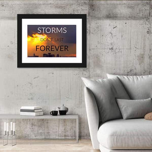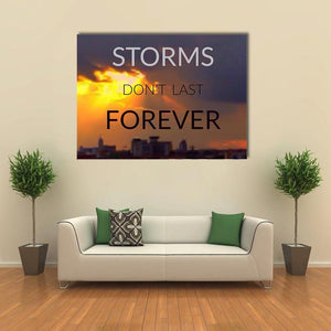 This inspirational canvas wall art features the phrase 'STORMS DON'T LAST FOREVER' against a backdrop of a striking sunset. The modern and minimalist design combines a palette of orange, black, white, and gray, creating a hopeful and resilient atmosphere.