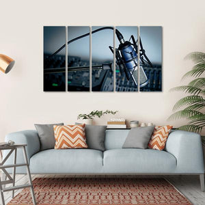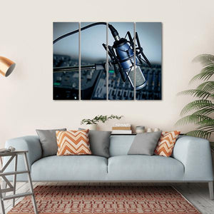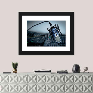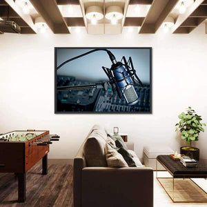 This canvas wall art captures the essence of music production with a striking blue condenser microphone and audio equipment set against a modern industrial backdrop. Its professional and focused atmosphere makes it a great addition to music studios or creative spaces.