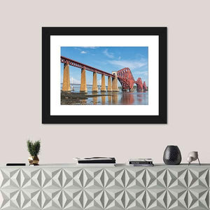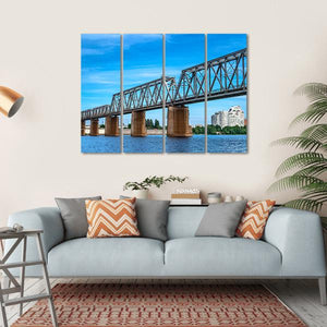 This canvas art features a serene depiction of a railway bridge spanning a tranquil river, nestled within an urban landscape. The calming palette of blue and grey reflects the peaceful atmosphere, making it an ideal addition to any room.