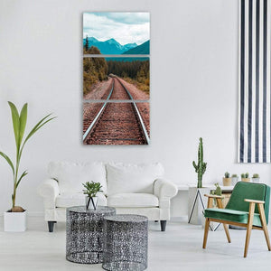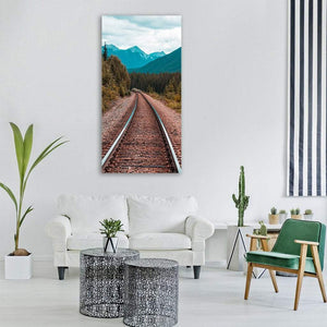 This canvas print depicts train tracks leading through a pine forest toward distant mountains under a cloudy daytime sky, with gravel ballast and strong perspective lines. The brown, green and blue palette creates a serene yet adventurous mood that fits rustic or nature-inspired rooms.